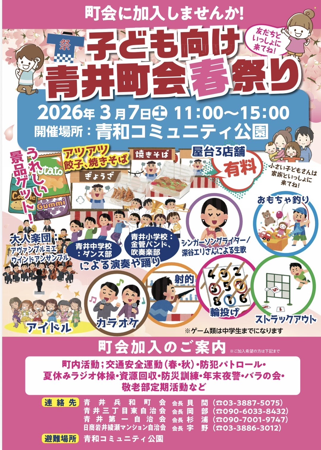 青井町会春祭り出演のお知らせ 演奏会情報 2026.03.02 2026年3月7日(土)に青和コミュニティ公園で行われるイベントにアヴァンプルミエ ウィンドアンサンブルが参加します!是非見に来てください♪ イベント名 青井町会春祭り イベント日程 令和8年3月7日(土)11時~15時※雨天決行(天候により一部内容が変更になる場合がございます。) 開催場所 東京都足立区青井3-22-1青和コミュニティ公園 グラウンド側 アヴァンプルミエの出演時間 11:40頃〜12:00 予定※雨天時は出演中止となります。当日SNSでお知らせいたします。